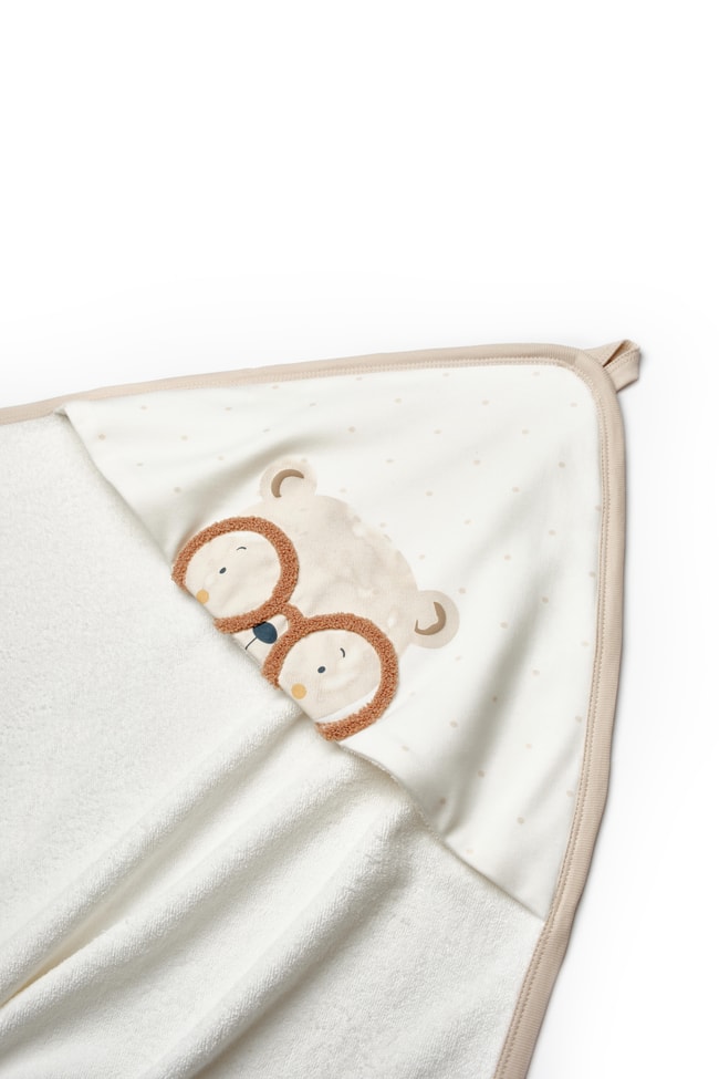 Yumuşak dokulu, %100 pamuk kapüşonlu havlu ve eldiven seti. Sevimli ayıcık figürlü başlık detayı ile dikkat çeker. Banyo sonrası rahat kurulanma sağlar.