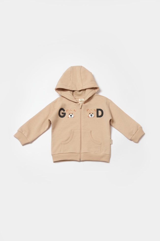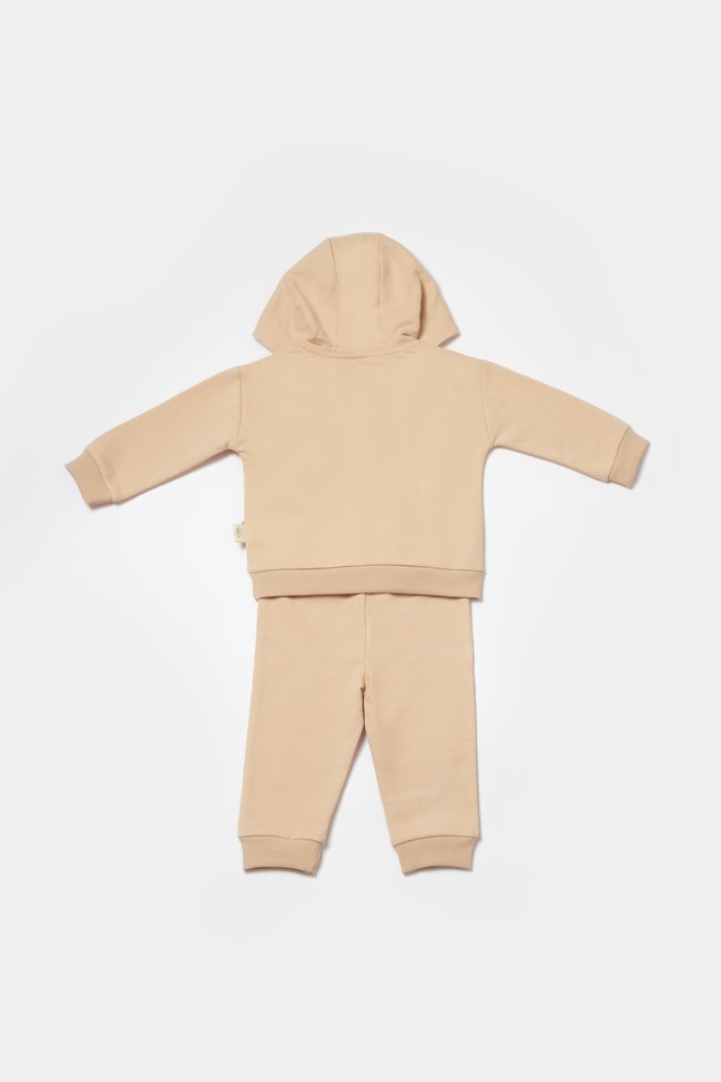 Bebekler için özel olarak tasarlanan bu pamuklu bej eşofman takımı, minimalist ve şirin tasarımıyla her ortama uyum sağlar. Üst parça; fermuarlı, kapüşonlu ve tatlı ayıcık baskı detayı ile dikkat çeker. Alt parça ise elastik bel yapısı, ip bağlama detayı ve yan kısmındaki “Things Are Coming” yazı baskısıyla modern bir dokunuş sunar. Yumuşak pamuk kumaşı bebeğinizin hassas cildine dosttur, nefes alabilir ve gün boyu konfor sağlar. Evde, parkta ya da dışarıda rahatça kullanılabilecek ideal bir settir.