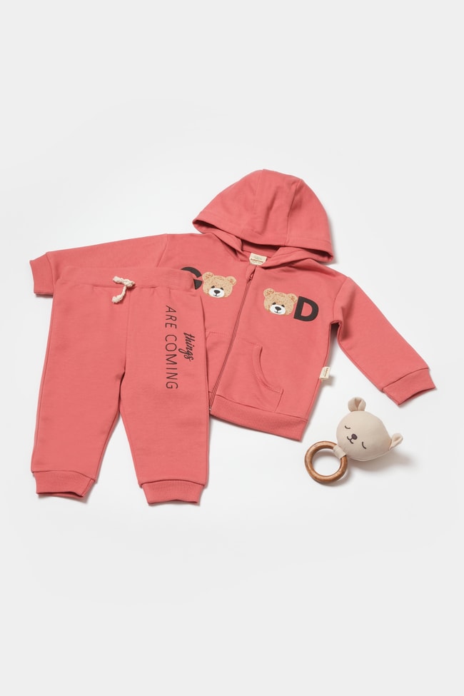 İki parçalı bebek takımı. Fermuarlı, kapüşonlu, ayıcık baskılı sweatshirt. Yanı yazı baskılı, elastik belli eşofman altı.
