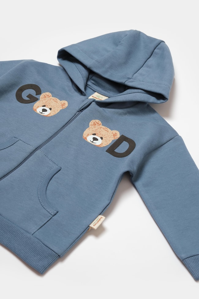 İki parçalı bebek takımı. Fermuarlı, kapüşonlu, ayıcık baskılı sweatshirt. Yanı yazı baskılı, elastik belli eşofman altı.