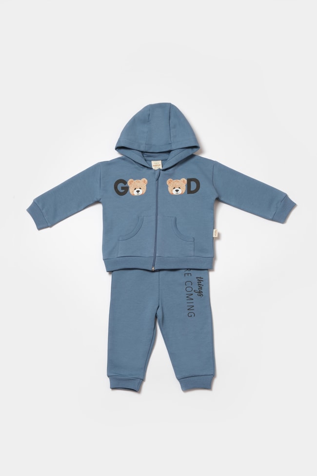 Bebek Pamuklu Mavi Kapüşonlu Ayıcık Baskılı Eşofman Takımı - İki Parça