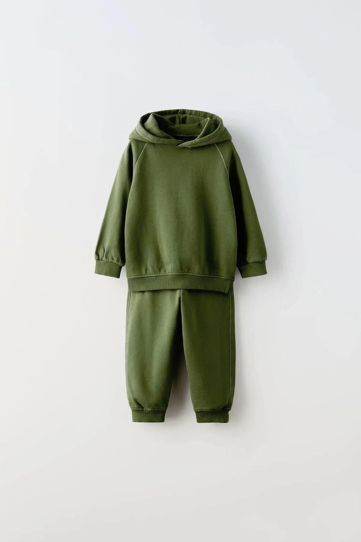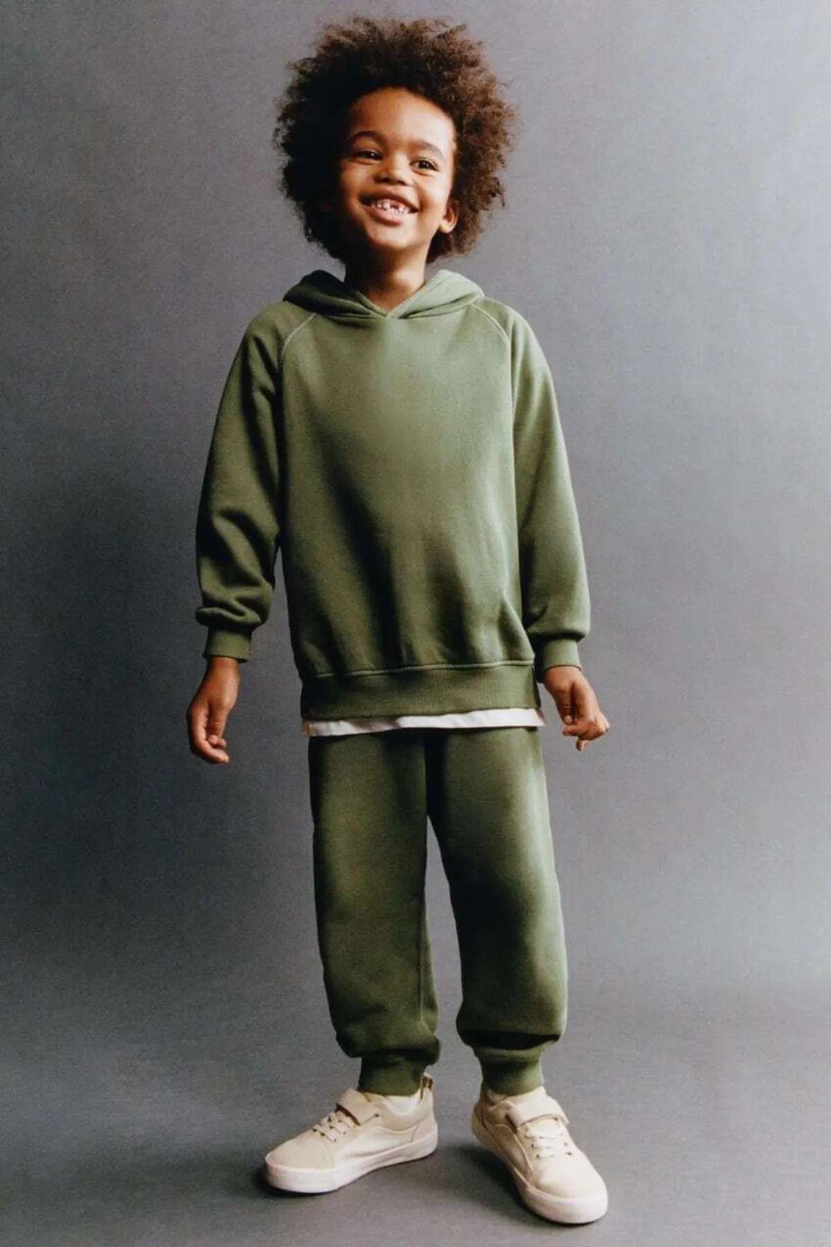 Çocuk Yeşil Basic Kapüşonlu Pamuklu Sweatshirt Alt-Üst Takım