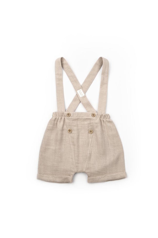 Üç parçalı yazlık takım. %100 pamuk müslin kumaştan ayıcık baskılı polo yaka tişört, düğmeli askılı şort ve şık bebek şapkası içerir.