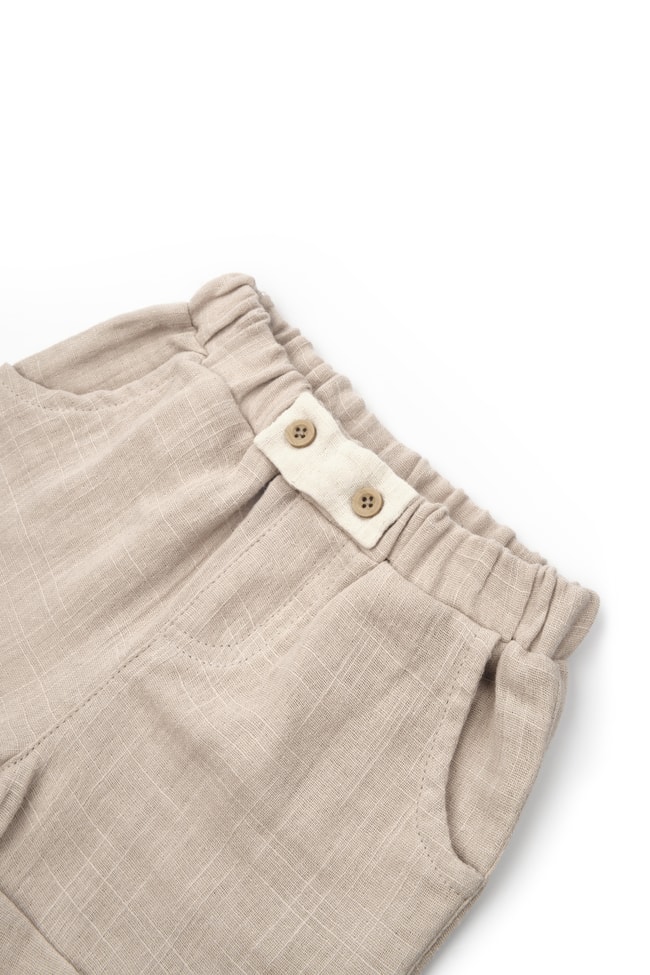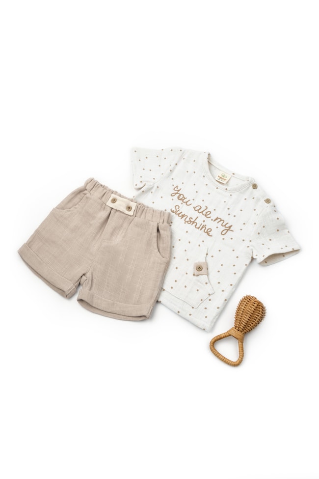 Takımı tamamlayan elastik belli, bej renkli şort; düğme detaylı, cepli ve rahat kesimiyle bebeklerin hareket kabiliyetini destekler. Hem kız hem erkek bebekler için uygundur. Müslin kumaş, nefes alabilen yapısıyla terletmez ve yaz sezonu için idealdir.