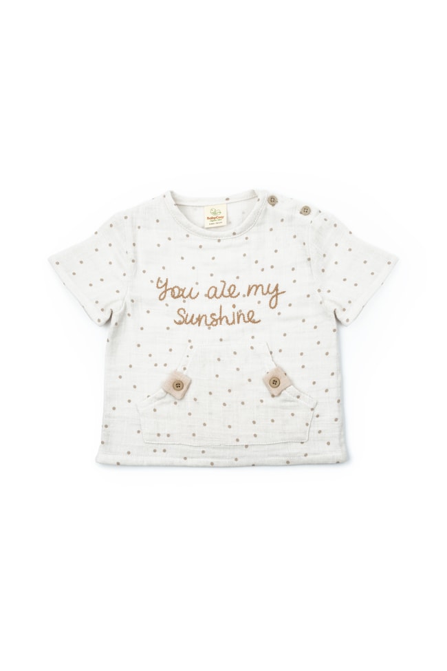 Yumuşacık dokulu %100 pamuk müslin kumaştan üretilen bu unisex bebek takımı, sıcak havalarda maksimum konfor sağlar. Önü “You are my sunshine” yazılı t-shirt, omuz kısmındaki düğme kapama ve cepli tasarımı ile hem şık hem pratik. Arka kısmı sade ve noktalı desenlidir.
