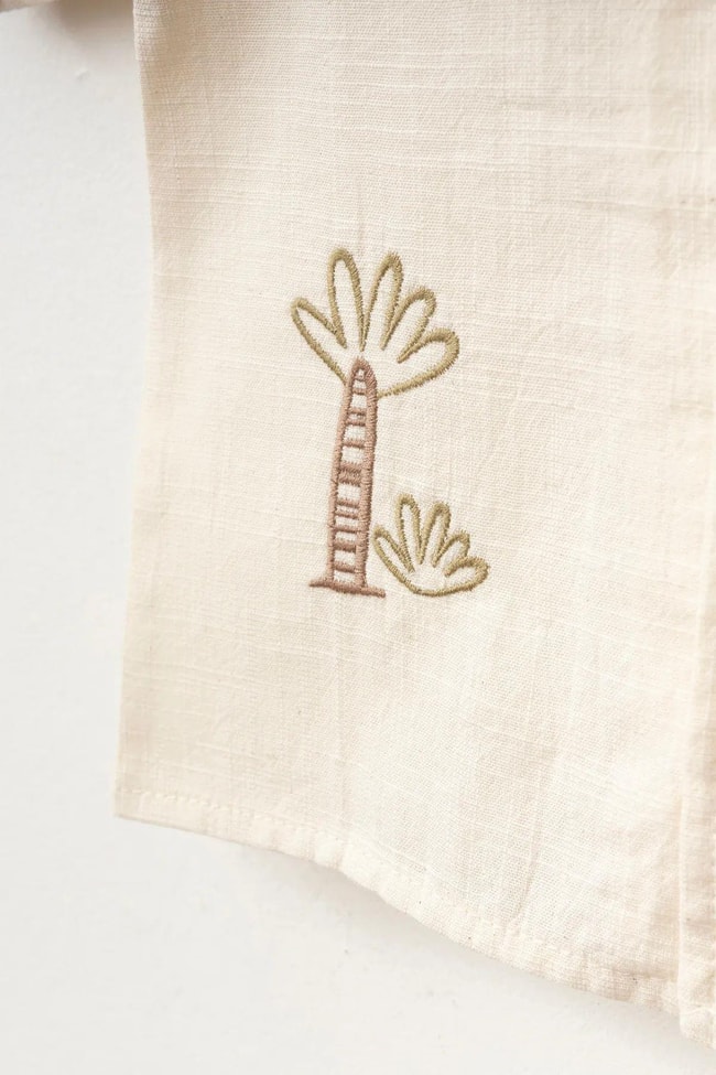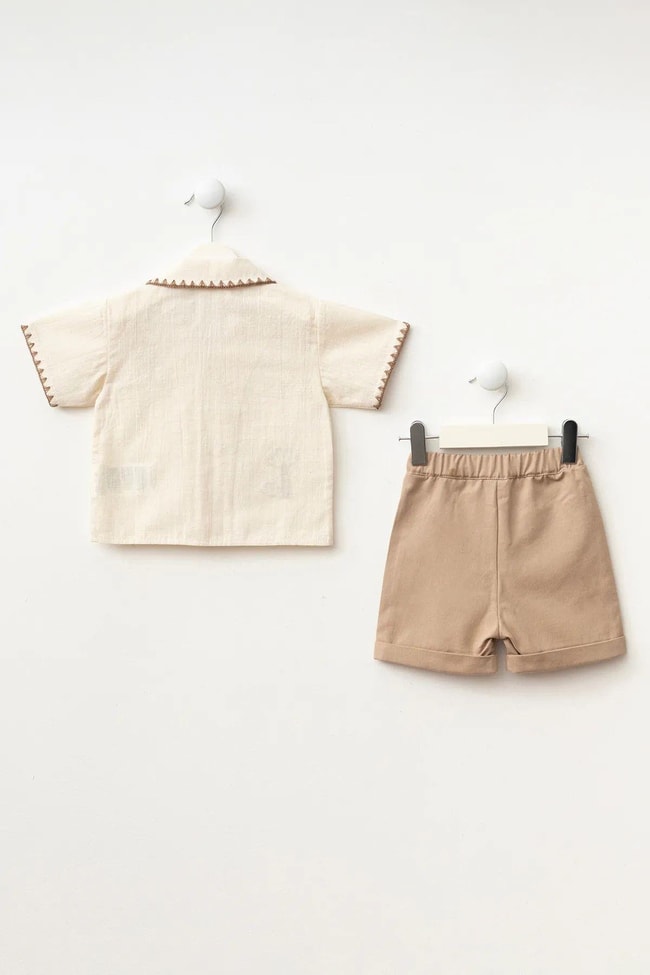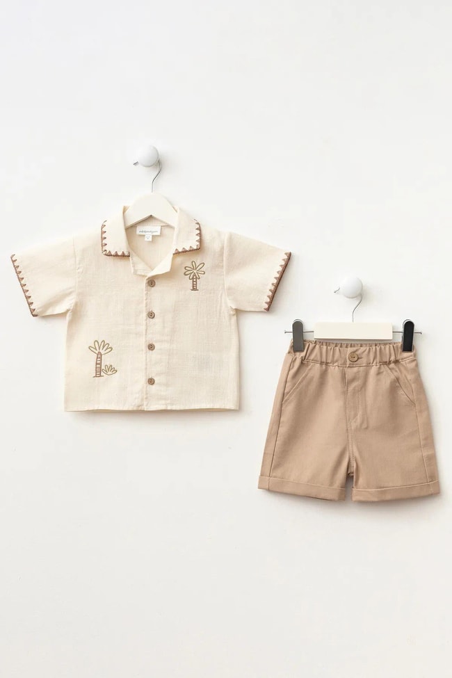 Kısa kollu, düğmeli gömlek. Palmiye nakış detaylı. Rahat kesim beli lastikli şort ile ikili takım.