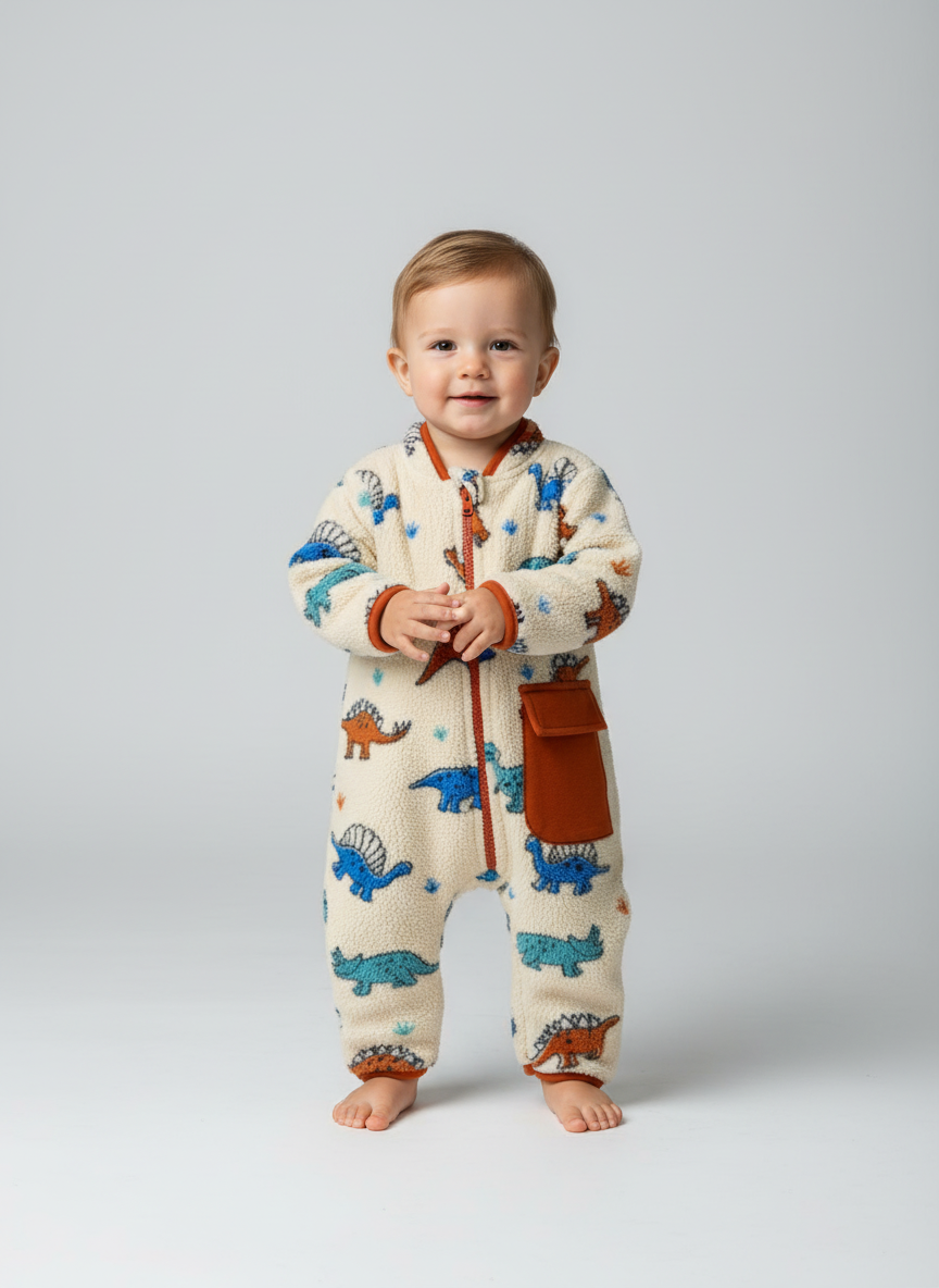 Yumuşak pamuklu peluş kumaştan üretilmiş tek parça tulum. Fermuarlı kapanış, kontrast cepli detay ve renkli hayvancık desenleriyle sıcacık bir stil sunar.