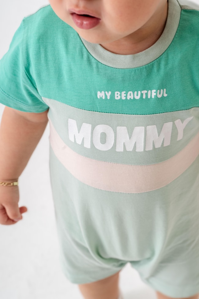 Erkek bebekler için özel olarak tasarlanan bu mint yeşili kısa kollu tulum, sevimli tasarımı ve konforlu yapısıyla dikkat çekiyor. Üst bölümünde "MY BEAUTIFUL MOMMY" yazısı yer alan tulum, hem görsel açıdan hem de duygusal anlamda şıklık sunuyor. %100 pamuklu kumaşı sayesinde hassas bebek cildine uygundur. Bisiklet yaka ve kısa kollu yapısıyla yaz aylarında serin ve rahat bir kullanım sağlar. Alt kısmındaki çıtçıt kapamalar sayesinde kolay giydirilip çıkarılabilir. Günlük kullanımda pratiklik ve şıklığı bir arada sunan bu tek parça tulum, bebekler için hediye alternatifi olarak da özenle paketlenebilir.