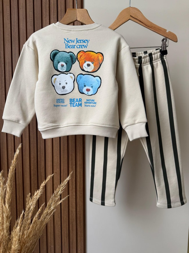 Sweatshirt’ün “New Jersey Bear Crew” temalı eğlenceli tasarımı çocukların favorisi olurken, esnek ribana detayları hareket özgürlüğü sunar. Çizgili alt parçası ise modern bir görünüm kazandırır. Günlük giyimde, okulda ya da dışarıda konforla kullanılabilir.