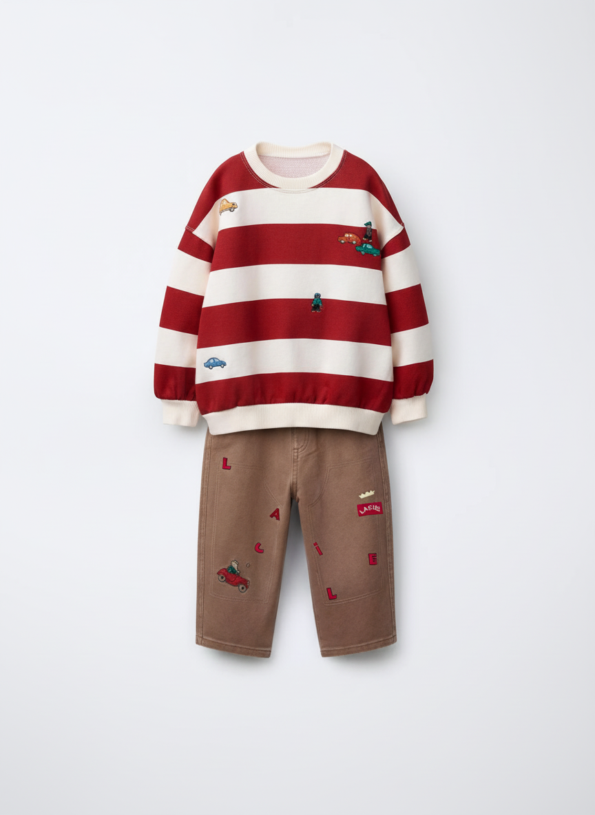Erkek çocuklar için tasarlanan bu pamuklu sweatshirt ve pantolon takımı, konforu ve şık detaylarıyla günlük kombinlerin favorisi olacak. Kırmızı-beyaz geniş çizgili sweatshirt, üzerine işlenen küçük araba nakışları ile enerjik bir görünüm sunarken, yumuşak kumaşı sayesinde gün boyu rahatlık sağlar. Kahverengi pantolon ise düz kesimi, ön cep detayları ve üzerinde bulunan nakış süslemeleriyle takıma hareketli bir tarz katar.