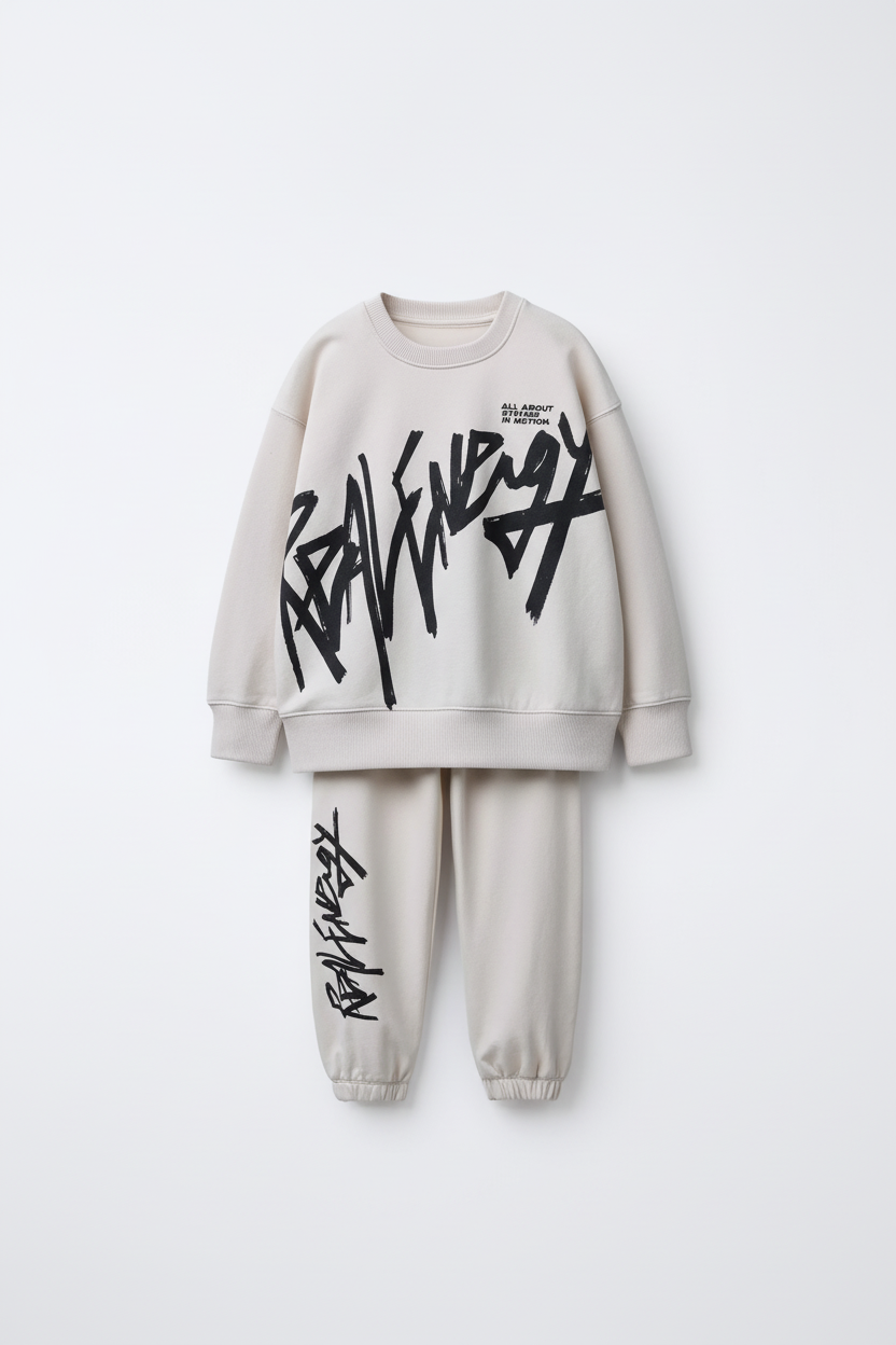 Erkek çocuklar için özel olarak tasarlanan pamuklu bej takım, modern sokak stilini rahatlıkla buluşturuyor. Takımın üst parçasında yer alan bisiklet yaka ve uzun kollu sweatshirt, ön yüzündeki büyük siyah graffiti baskısıyla dinamik bir görünüm sunuyor. Yumuşak ve nefes alabilen pamuklu kumaşı sayesinde gün boyu konfor sağlıyor.