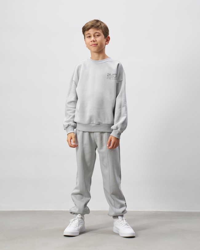 Erkek çocuklar için tasarlanan bu gri takım, minimal ve modern stiliyle öne çıkıyor. Sweatshirt modeli, küçük yazı baskısı ve bisiklet yaka formuyla sade ama şık bir görünüm sunarken, pamuklu kumaşı sayesinde gün boyu rahatlık sağlar. Takımı tamamlayan gri eşofman altı ise elastik bel ve paça yapısıyla konforlu kullanım imkânı verir. Spor ayakkabılarla kombinlenerek okulda, evde veya dışarıda günlük kullanım için ideal bir seçenek sunar. Basic tasarımıyla hem spor hem de günlük şıklık arayan erkek çocukların gardırobunda yerini alacak.