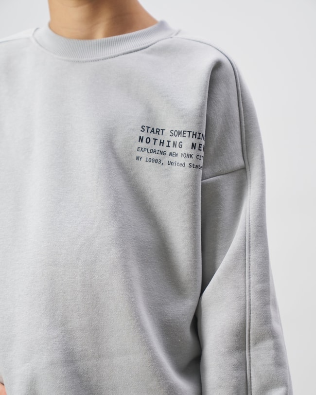 İki parçalı takım. Bisiklet yaka, uzun kollu yazı baskılı sweatshirt. Elastik bel ve paça detaylı gri eşofman altı.
