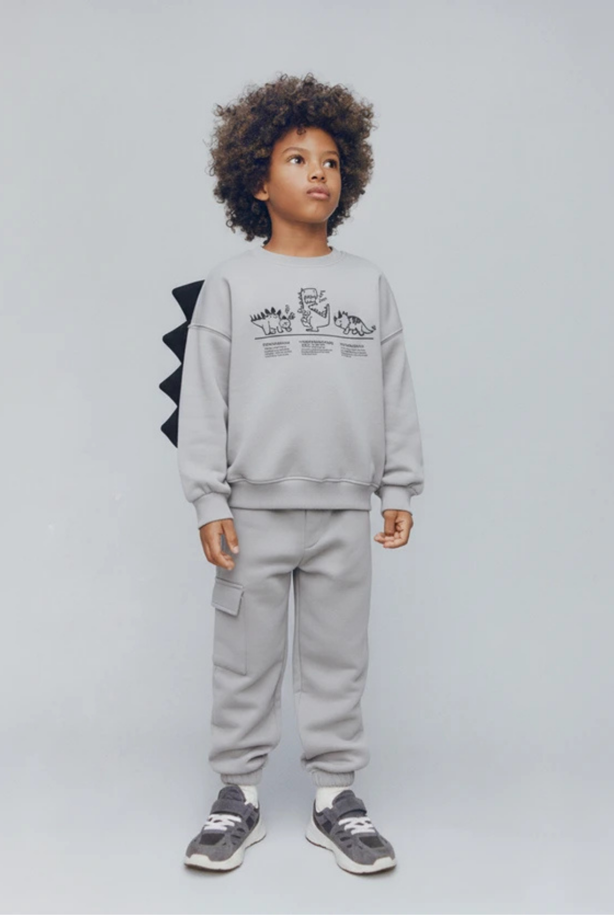 Erkek çocuklara özel hazırlanan bu gri eşofman takımı, sevimli dinozor baskılarıyla miniklere eğlenceli bir görünüm kazandırır. Üst kısmında farklı dinozor figürleri yer alan bisiklet yaka sweatshirt, hem şık hem de rahat bir kullanım sunar. Alt kısmında ise yan cepler ve kargo cep detayıyla pratiklik ön plandadır. Pamuklu kumaşı sayesinde yumuşak ve nefes alabilen bu takım, oyun saatlerinden günlük kombinlere kadar her an konfor sağlar.