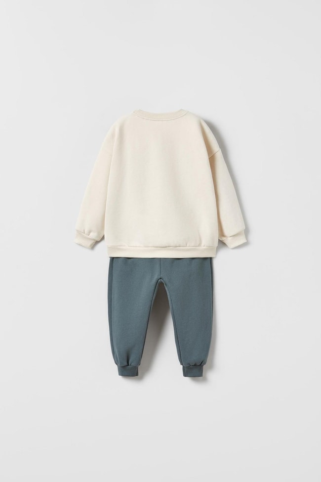 İki parçalı takım. Bisiklet yaka, uzun kollu, köpek baskılı pamuklu sweatshirt. Elastik belli, ribana paçalı, yumuşak dokulu eşofman altı.