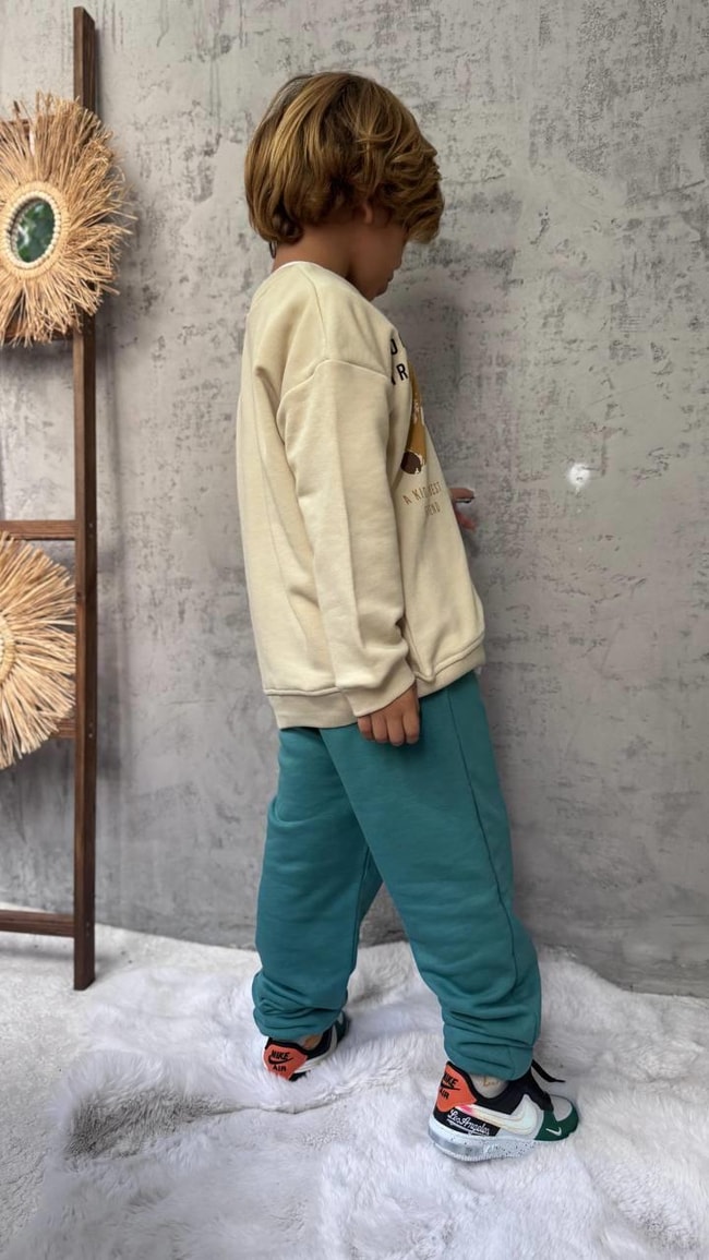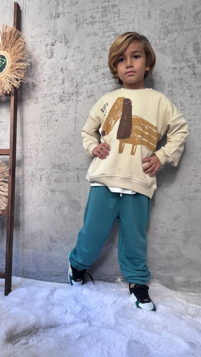Minik dostların konforu için tasarlanan bu pamuklu sweatshirt ve eşofman altı takımı, günlük kullanımda hem rahatlık hem de sevimli bir stil sunar. Krem renkli sweatshirt üzerindeki köpek baskısı, “A Kid’s Best Friend” sloganı ile neşeli bir görünüm kazandırır.