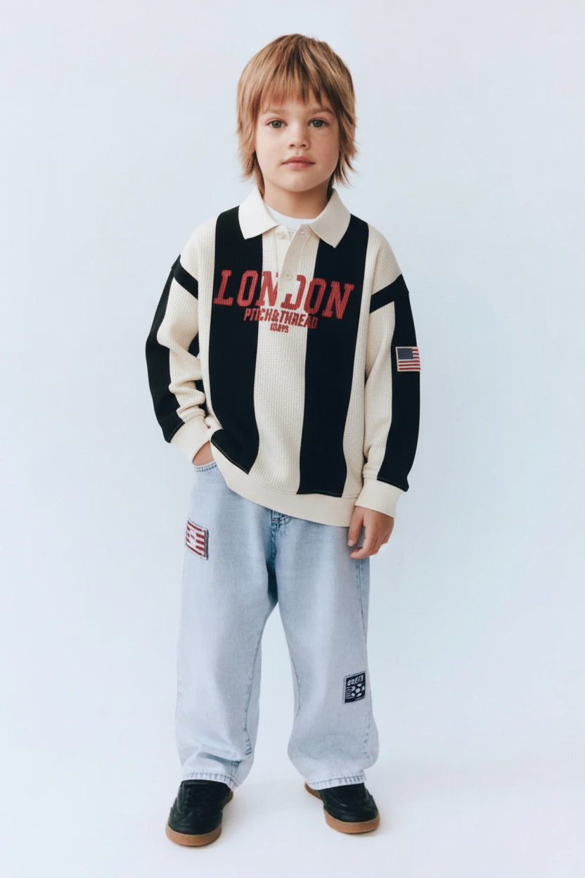 Erkek çocuklar için tasarlanan bu pamuklu takım, günlük kombinlerde şıklığı ve rahatlığı bir araya getiriyor. Polo yaka ve uzun kollu sweatshirt, ön kısmındaki London baskısı ve kol üzerindeki nakışlı detaylarla sportif bir stil sunar. Geniş paça jean pantolon ise rahat kalıbı ve üzerindeki nakış işlemeleriyle modern bir görünüm kazandırır. Nefes alabilen pamuklu kumaşı sayesinde çocukların gün boyu konforlu hissetmesine yardımcı olur. Hem okul kombinlerinde hem de hafta sonu gezilerinde rahatlıkla tercih edilebilecek bu takım, stil sahibi miniklere özel tasarlandı.