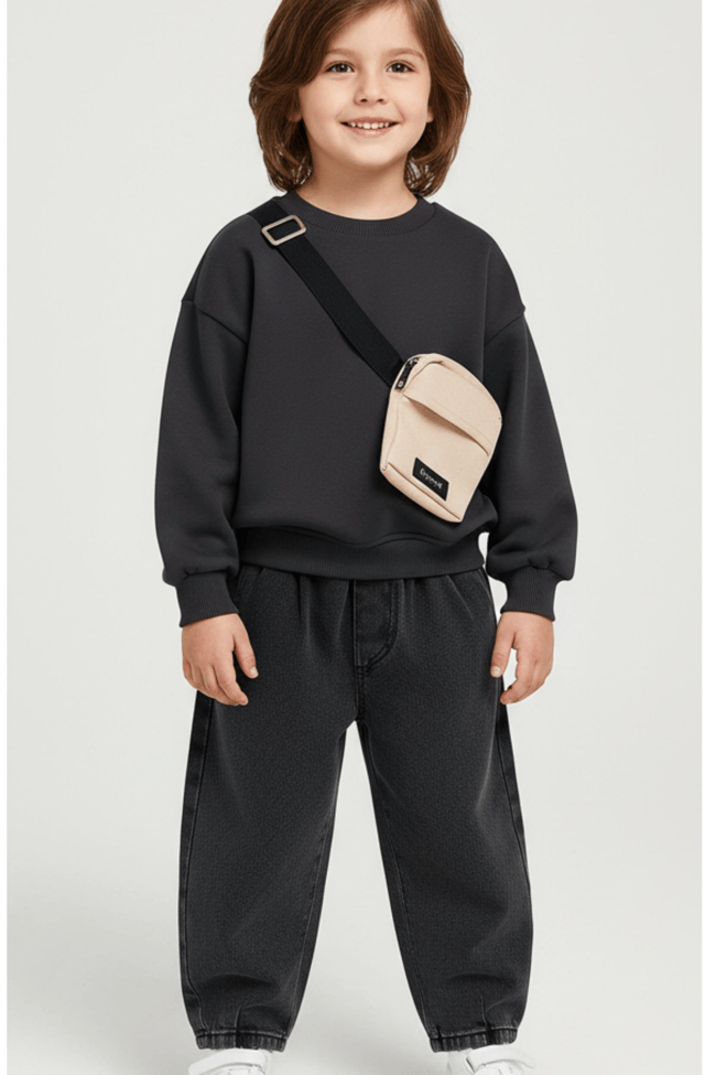 İki parçalı pamuklu takım. Yuvarlak yaka, uzun kollu sweatshirt. Ön kısmında mini çanta ve askı detayı bulunur. Elastik belli, rahat kesimli pantolon.