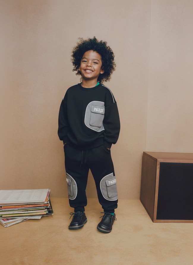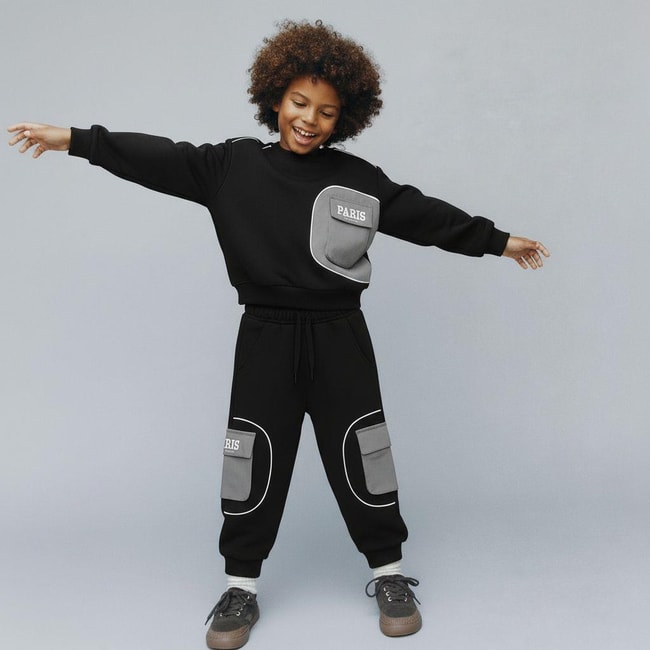 İki parçalı takım. Bisiklet yaka, uzun kollu, Paris yazılı cepli sweatshirt. Yanları kontrast gri cepli, elastik belli jogger alt.