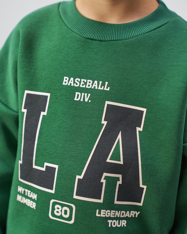 Erkek çocukları için tasarlanan pamuklu yeşil eşofman takımı, sportif görünümü ve rahat kalıbıyla öne çıkar. Üst kısmı bisiklet yaka, uzun kollu ve LA baskılı sweatshirt formunda olup hem modern hem de enerjik bir stil sunar. Alt kısmı elastik beli ve paça lastikli tasarımıyla gün boyu hareket özgürlüğü sağlar.