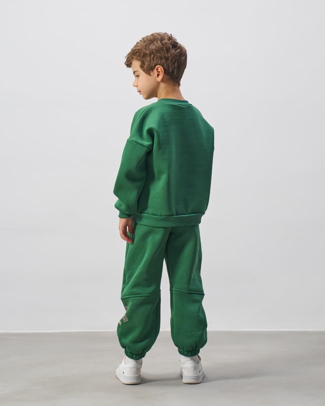 Yumuşak pamuklu kumaşıyla cilde dost olan bu takım, nefes alabilen yapısıyla konforlu bir kullanım sunar. Okul, spor aktiviteleri ya da günlük kombinlerde şıklığı ve rahatlığı bir araya getirir. Sportif havası ve trend yeşil rengi sayesinde çocukların gardırobunda öne çıkan parçalardan biri olacaktır.