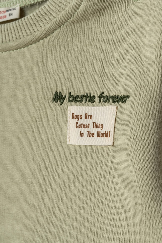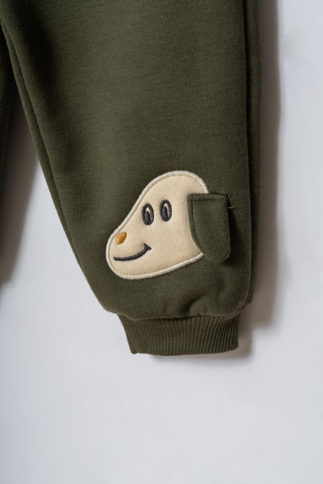 İki parçalı takım. Bisiklet yaka, uzun kollu pamuklu sweatshirt. Elastik belli, paça lastikli, köpek nakışlı eşofman altı.