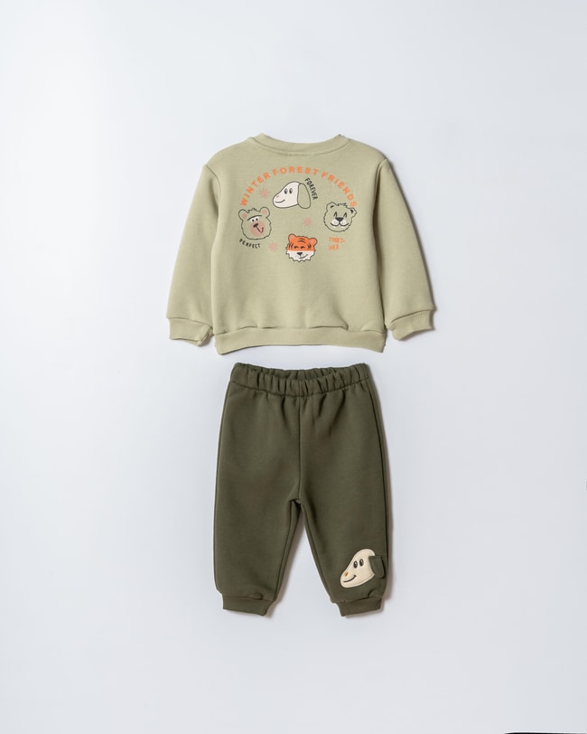 Erkek çocuklar için özel olarak tasarlanan bu pamuklu ikili takım, hem rahatlığı hem de sevimli detaylarıyla öne çıkıyor. Üst parçası bisiklet yaka, uzun kollu ve yeşil tonlarında olup üzerinde yer alan minimal yazı baskısıyla modern bir görünüm sunar. Alt parça ise elastik bel yapısı sayesinde rahat giyilip çıkarılabilen, paça lastikli ve köpek nakış detayıyla çocukların keyifle giyeceği bir eşofman altıdır. Pamuklu kumaşı cilt dostudur, yumuşak dokusu ile gün boyu konfor sağlar. Günlük kullanım, park oyunları ve ev içi rahatlığı için ideal olan bu takım, çocuğunuzun gardırobuna şık ve pratik bir seçenek olarak eklenir.