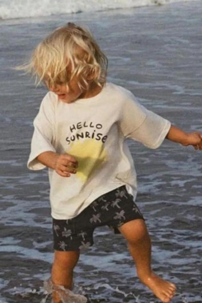 Bu yazlık erkek çocuk takımı, rahat kesimi ve yumuşak dokusuyla çocukların gün boyu konforla hareket etmesini sağlar. Üst kısmında enerjik bir hava katan "Hello Sunrise" güneş baskısı, alt kısmında ise tropikal palmiye desenli şort yer almaktadır. Elastik bel detayına sahip şort, kolay giyilip çıkarılabilirken, geniş kesimli tişört modeli sayesinde çocuklara ekstra rahatlık sunar. Günlük kullanım, tatil veya oyun saatleri için mükemmel bir seçenektir.