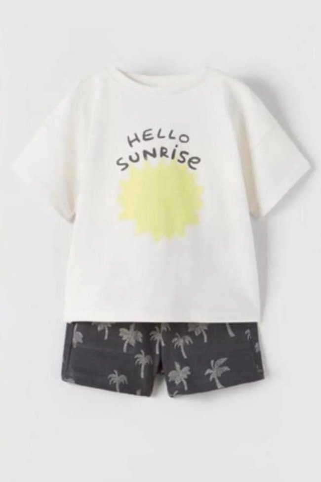 Yazın enerjisini yansıtan bu rahat ve şık erkek çocuk şortlu takım, sıcak günler için ideal bir seçenek! Hafif ve nefes alabilen pamuklu kumaşı ile miniklerin konforunu ön planda tutarken, eğlenceli "Hello Sunrise" baskısı ve palmiye desenli şortuyla tarzını tamamlıyor.