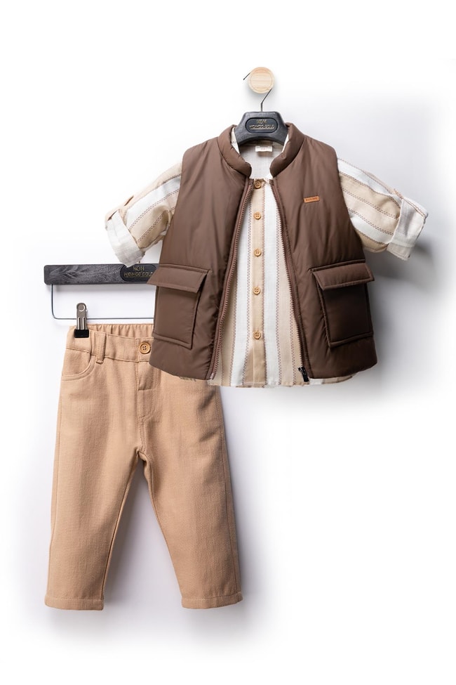 Düz yaka ve uzun kollu çizgili gömlek. Cepli yelek ve rahat kesim pamuklu pantolon.
