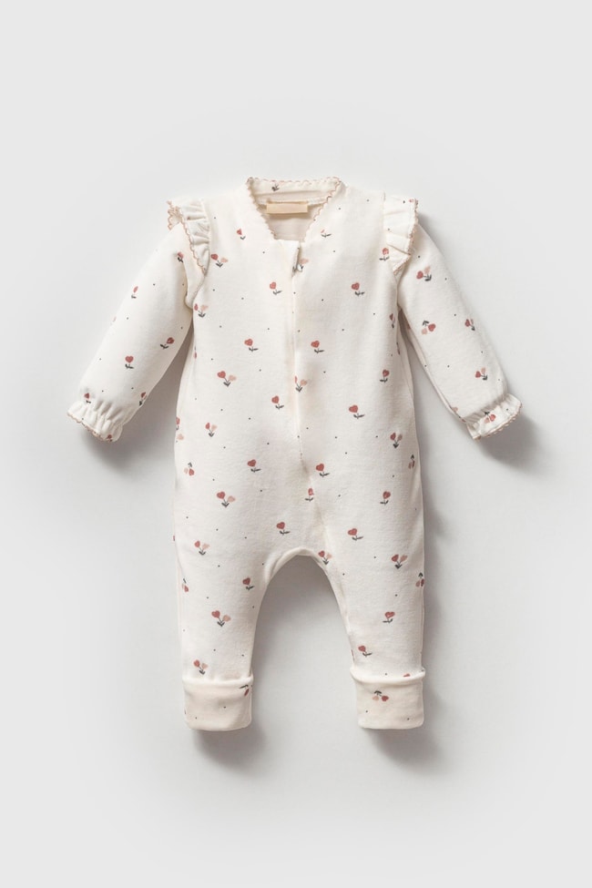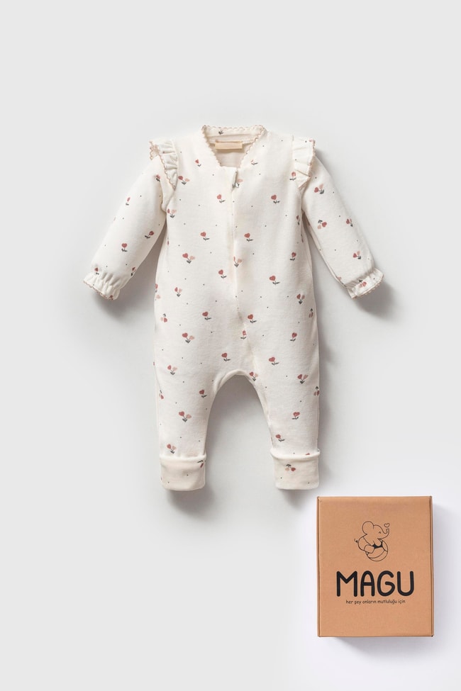 Kız Bebek Organik Pamuklu Ekru Çiçek Desenli Fırfır Kollu Tulum - Rahat ve Şirin