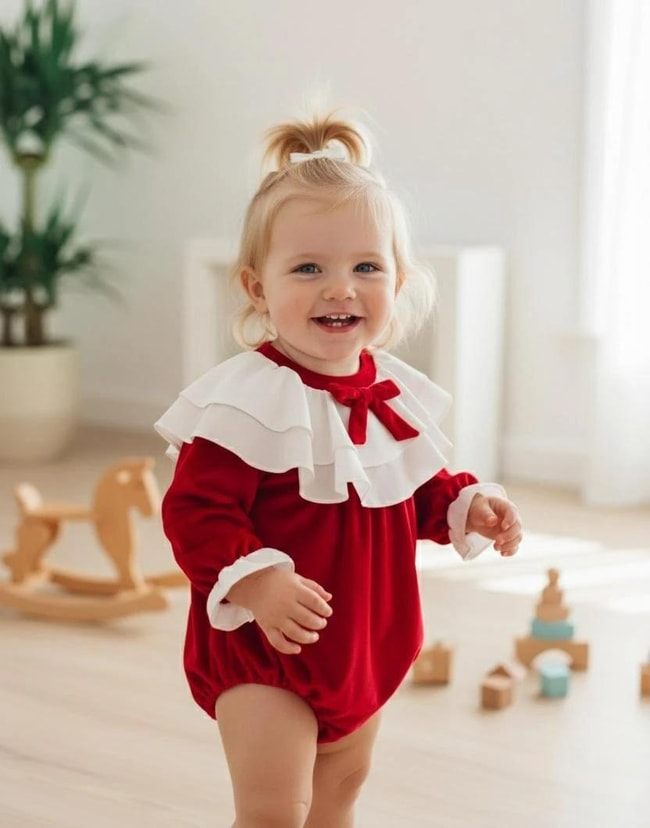 Yumuşak pamuklu kumaştan üretilmiş uzun kollu tulum. Volanlı yaka detayı, ön kısmında kadife fiyonk süsleme ve elastik bilekler ile zarif bir görünüm sunar.
