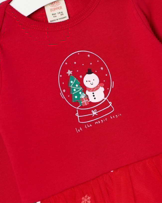 Uzun kollu pamuklu body, kardan adam ve çam ağacı baskılı. Alt kısmı tül etek detaylı, çıtçıtlı kapamalı. Takım içinde uyumlu tül saç bandı bulunur.
