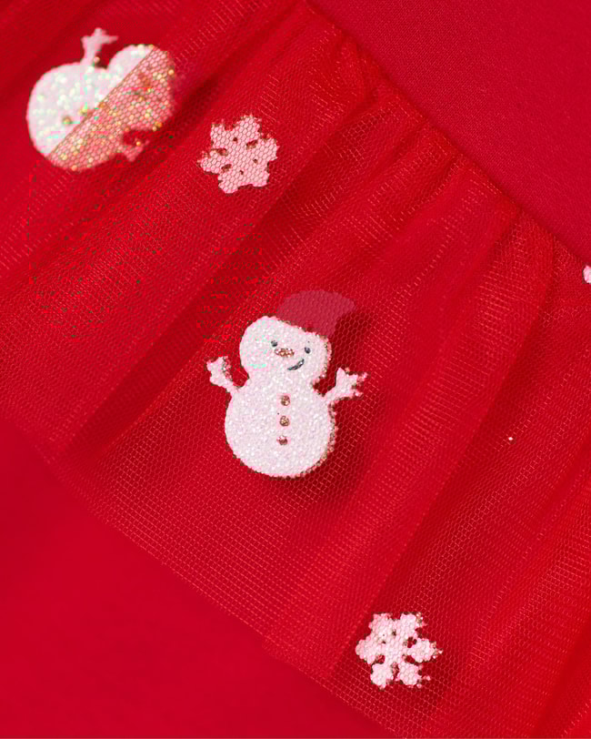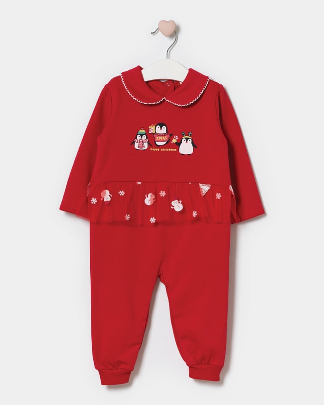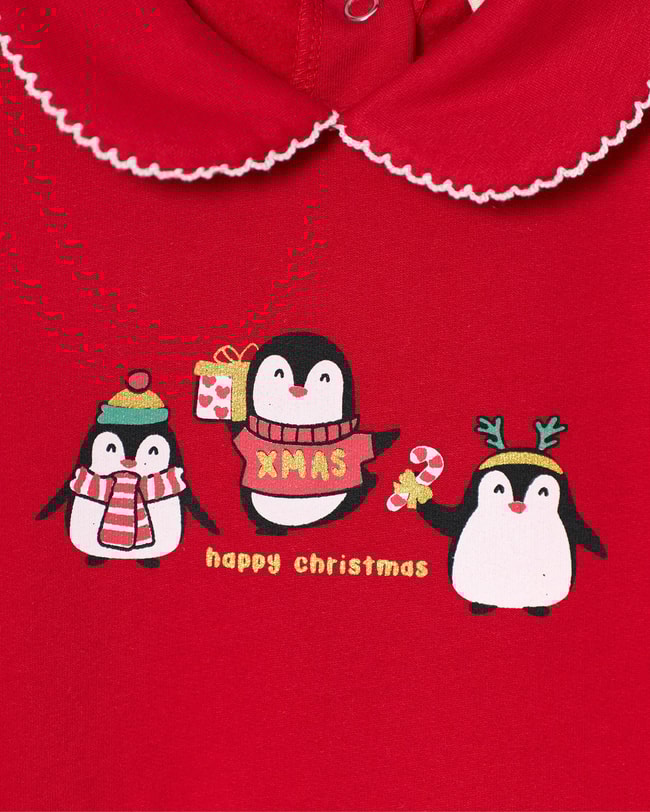 Kız bebekler için özel olarak tasarlanan bu kırmızı pamuklu tulum, yılbaşı dönemine neşe katıyor! Yumuşak dokulu pamuk kumaşıyla bebeğinizin cildini nazikçe sararken, üst kısmındaki sevimli penguen baskıları ve “Happy Christmas” detayı tatlı bir görünüm sunar. Yaka kısmındaki beyaz dikişli peter pan yakası zarif bir dokunuş ekler. Bel bölümündeki tül fırfır, içinde minik kardan adam ve kar tanesi desenleriyle dikkat çeker. Arka kısmındaki çıtçıt kapama sayesinde kolay giydirme imkânı sunar, ribanalı paçaları ise konforu artırır. Yılbaşı partileri, fotoğraf çekimleri veya evde sıcacık kutlamalar için mükemmel bir seçimdir.