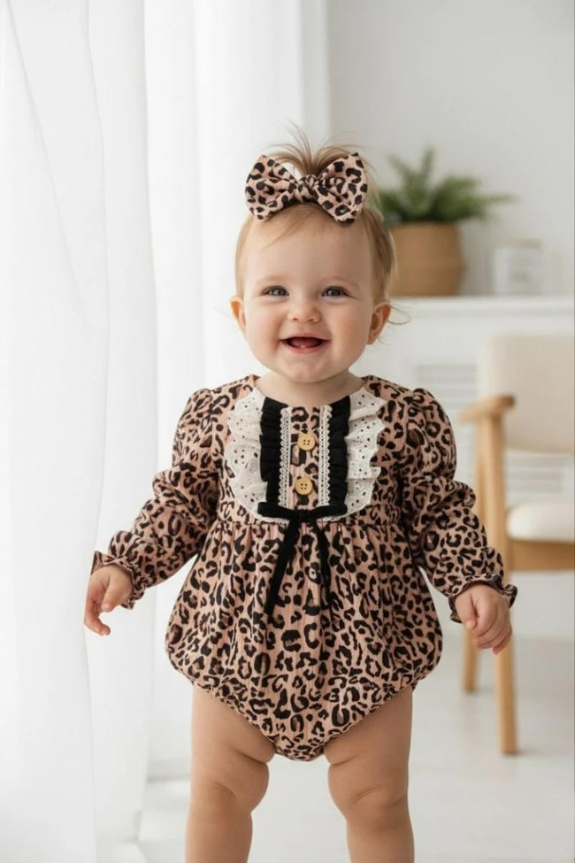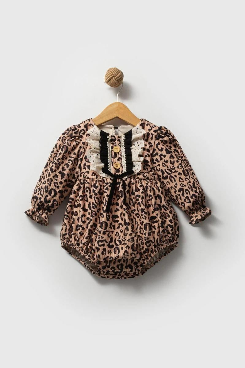 Leopar desenli pamuklu kumaştan üretilmiş uzun kollu tulum. Göğüs kısmında dantelli volan detaylar, ahşap düğmeler ve kadife fiyonk süsleme ile zarif bir görünüm sunar.