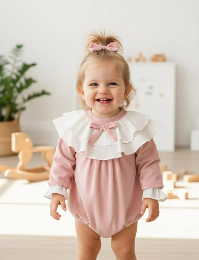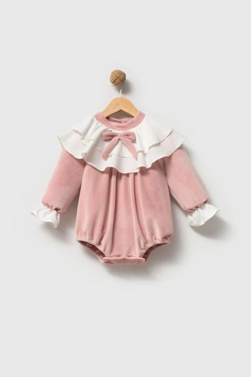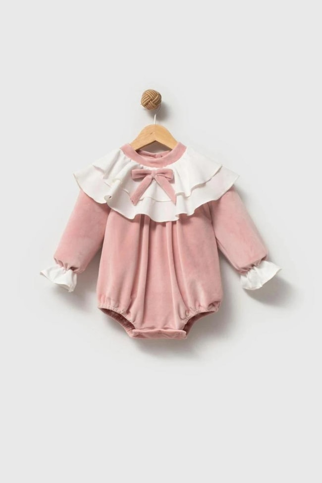 Yumuşak pamuklu kumaştan üretilmiş uzun kollu elbise. Geniş beyaz yaka, kadife fiyonk ve pompon şerit detayları ile zarif bir görünüm sunar.