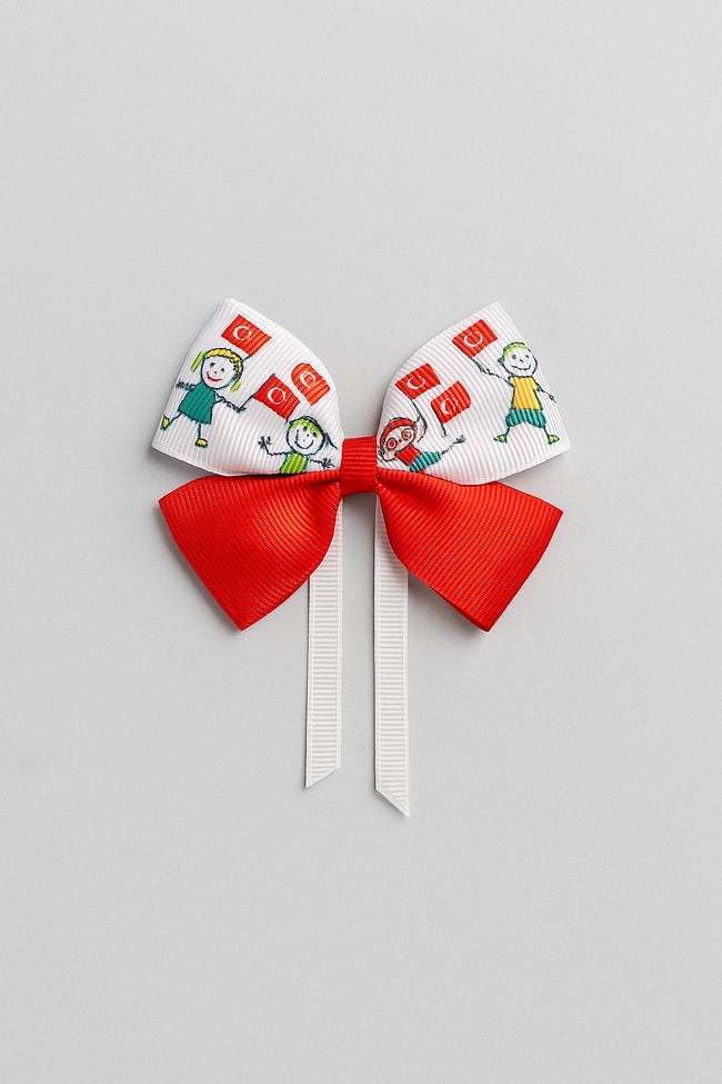 Bayrak desenli, çocuk figürlü pamuk dokulu fiyonk toka. 23 Nisan ve özel gün kutlamaları için ideal tamamlayıcı.
