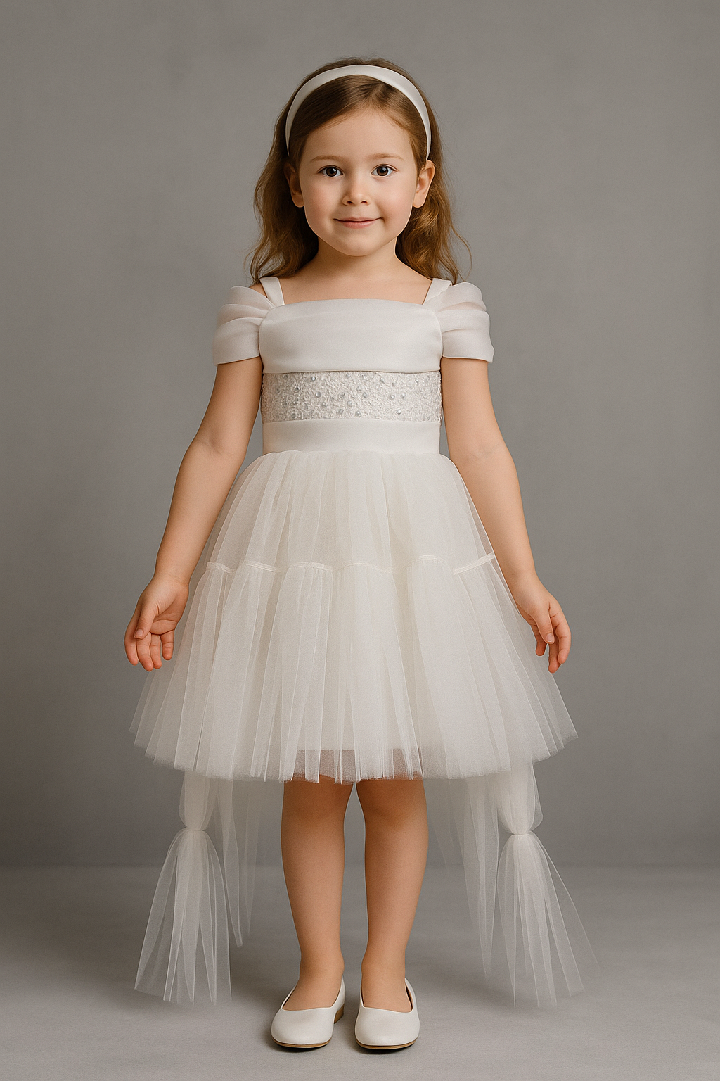 Bu beyaz kız çocuk abiye elbise, asimetrik etek kesimiyle modern bir tarz sunarken, sade ve zarif detaylarıyla öne çıkar. Önden kısa, arkadan uzun tül etek yapısı; yürürken hareket katar ve fotoğraflarda göz alıcı bir siluet oluşturur. Bel kısmı, inci ve taş işlemeleriyle süslenmiş saten kuşakla şık şekilde tamamlanır. Düşük omuzlu kısa kol detayı ve ekstra tül bağlı arka aksesuarlar elbiseye özgünlük kazandırır. Hafif yapısı sayesinde çocuğunuz rahatça hareket edebilir. Düğün, doğum günü, bayram ve özel organizasyonlar için ideal bir seçimdir.
