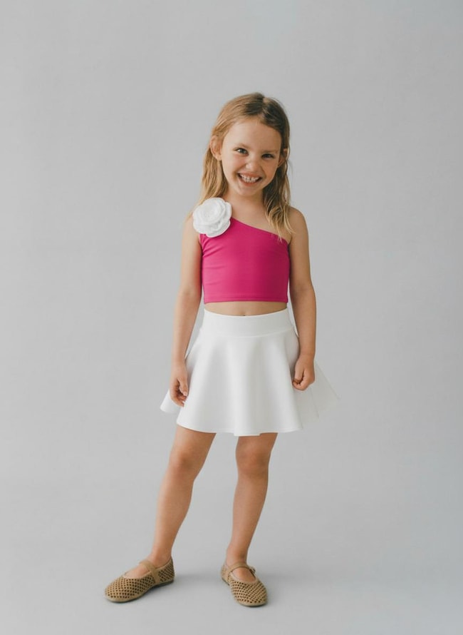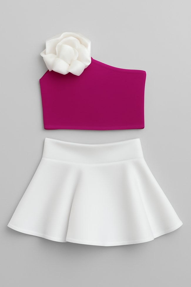 Kız çocukları için hem şık hem de rahat bir seçenek arayanlar için bu mor crop üst ve beyaz etekli takım mükemmel bir tercih. Üst parça dalgıç kumaştan üretilmiş olup, tek omuz detayı ve beyaz çiçek aksesuarı ile zarif bir hava katar. Alt kısmı ise yuvarlak etek formunda, hareketli ve rahat bir kullanım sunar.