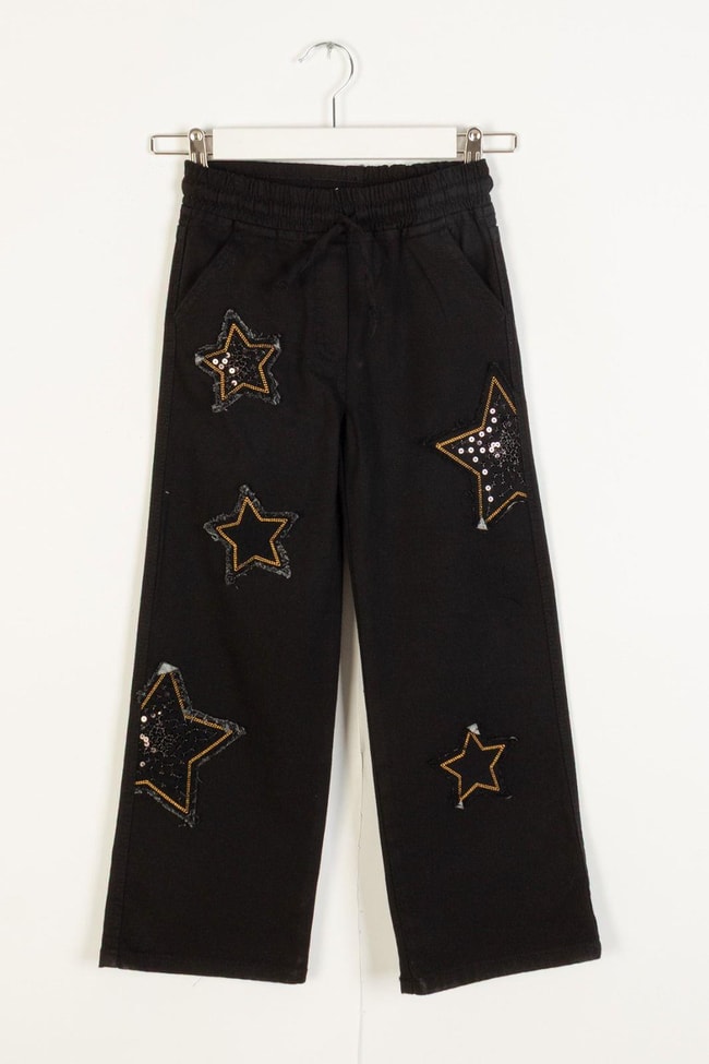 Minik yıldızlara özel tasarlanan bu siyah kız çocuk pantolonu, parıltılı yıldız aplikeleriyle dikkat çekiyor. Pamuklu kumaşı sayesinde yumuşak dokulu ve konforlu bir kullanım sunarken, elastik beli çocuğunuzun rahatça giyip çıkarmasını kolaylaştırır. Üzerindeki ışıltılı pullarla süslenmiş yıldız detaylar, pantolona enerjik ve stil sahibi bir görünüm kazandırır. Geniş paça kesimiyle hem modern hem de rahat bir alternatif olan bu model, tişört ve sweatshirtlerle kolayca kombinlenebilir. Günlük giyimde fark yaratmak isteyen kız çocukları için ideal bir tercih.