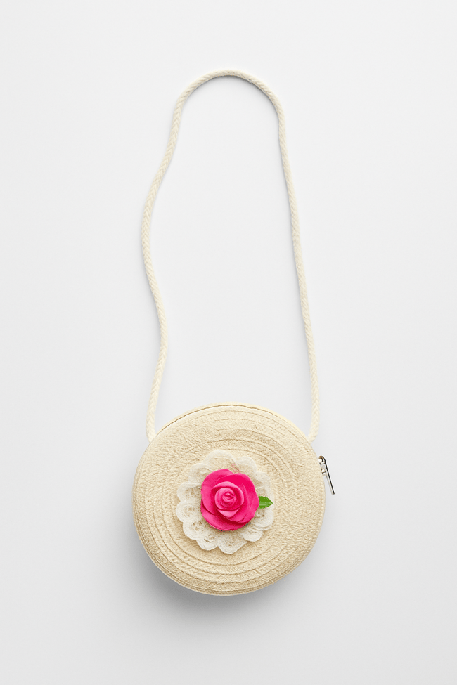 Minik stil ikonları için tasarlanmış bu kız çocuk çapraz çanta, doğal hasır dokusuyla yaz stilini yansıtırken şıklığı da beraberinde getiriyor. Yuvarlak formu ve yumuşak dokusu, zarif dantel üzerine yerleştirilmiş canlı pembe gül aplikesiyle tamamlanıyor. Hafif yapısı sayesinde çocuklar kolayca taşıyabilir, fermuarlı yapısı ise eşyalarını güvenle saklamasını sağlar. Omuz askısı esnek ve dayanıklıdır. Günlük kombinler için ideal olduğu gibi doğum günü, bayram veya özel gün hediyesi olarak da harika bir tercih.