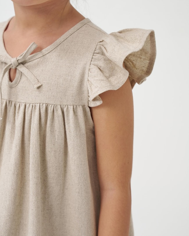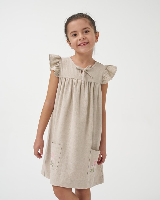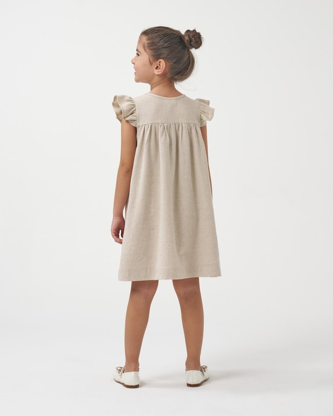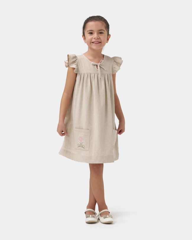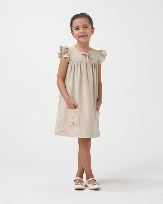 Bej keten dokusuyla zamansız bir görünüm sunan bu elbise, hem günlük kullanımda hem de özel yaz etkinliklerinde rahatlıkla tercih edilebilir. Hafif dökümlü kesimi sayesinde çocukların özgürce hareket etmesini sağlar. Şehir gezileri, yaz davetleri, doğum günü kutlamaları ve aile buluşmaları için sade ama şık bir tercihtir.