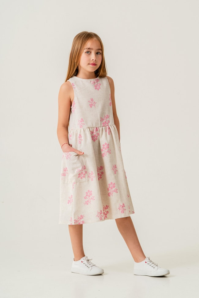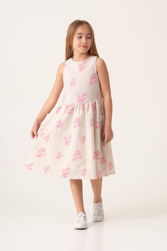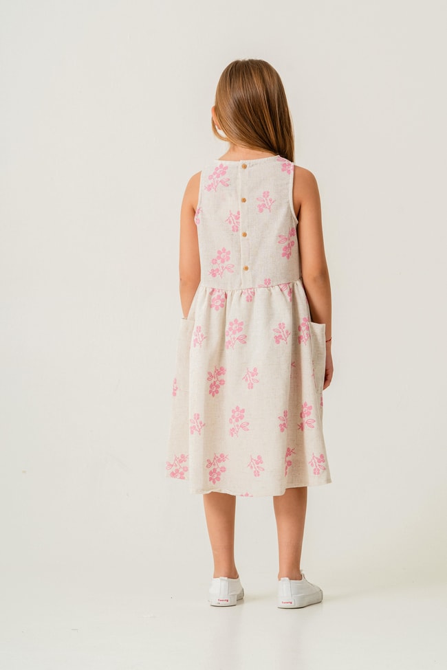 Doğal keten kumaştan üretilmiş bu hafif ve nefes alabilen çiçek desenli elbise, yaz aylarında çocuklara konfor ve zarafet sunar.