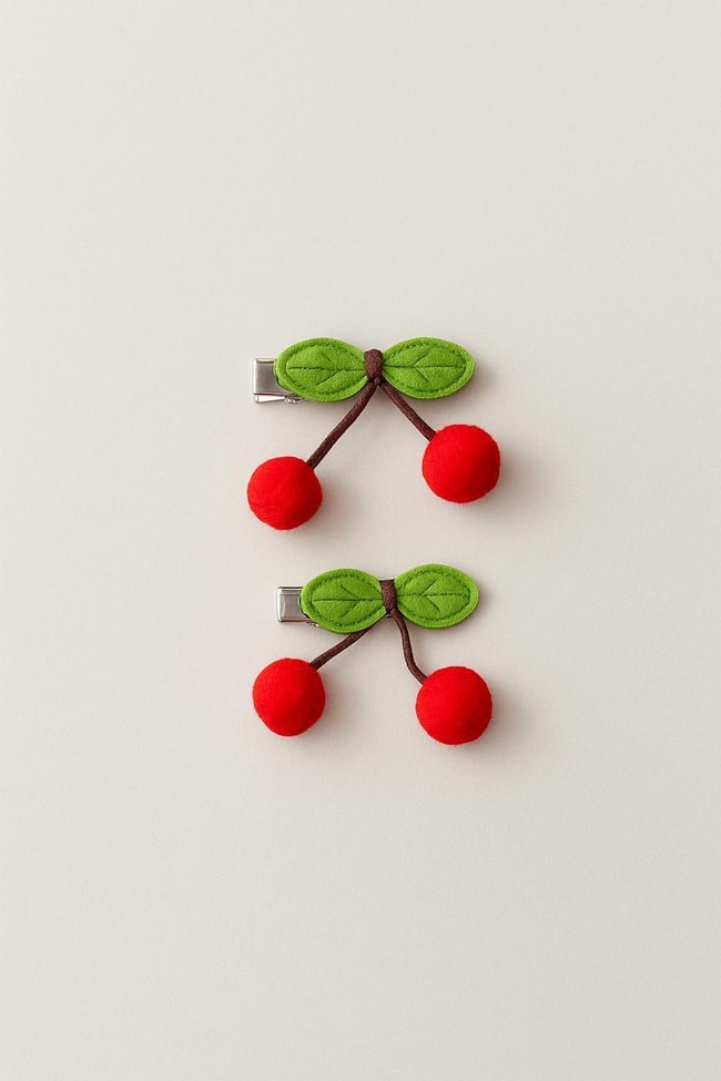 Kız çocuklarının saçlarına tatlı bir dokunuş katacak bu kiraz figürlü toka seti, canlı renkleri ve eğlenceli tasarımıyla dikkat çekiyor. Set içerisinde iki adet toka yer alır. Her bir tokada yeşil yaprak detayı ve peluş görünümlü kırmızı kiraz topları bulunur. Metal klips yapısı sayesinde saçtan kaymaz, kolay takılıp çıkarılır. Günlük kombinlere renk katar, doğum günü, parti ve özel günlerde de rahatlıkla tercih edilebilir. Yumuşak dokulu kumaş kaplaması ile saçları çekmez, çocukların konforu düşünülerek tasarlanmıştır. Hediye olarak da şık bir alternatiftir.