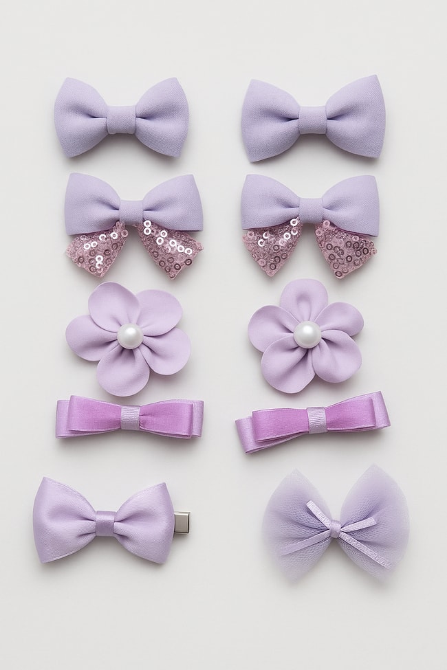 Kız çocukları için özenle tasarlanmış bu 10’lu toka seti, lila tonlarının yumuşaklığıyla saçlara zarif bir hava katıyor. Set içerisinde; sade kumaş fiyonklar, payet detaylı fiyonk tokalar, saten inci çiçekli tokalar, parlak saten fiyonklar ve tül fiyonk modelleri yer alır. Her biri farklı formda tasarlanan bu tokalar, kolay kullanım sağlayan klips mekanizması sayesinde saçta sabit durur. Doğum günlerinde, özel günlerde veya günlük stilin tamamlayıcısı olarak rahatlıkla tercih edilebilir. Hem görsel çeşitliliği hem de estetik sunumuyla bu toka seti, hediye alternatifi olarak da şık bir seçenektir.