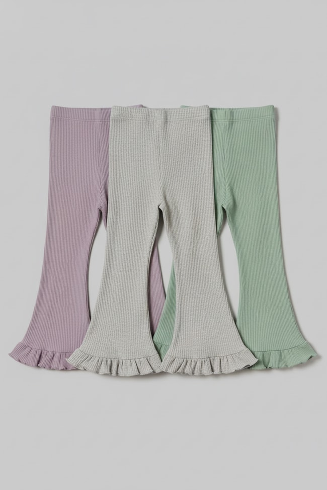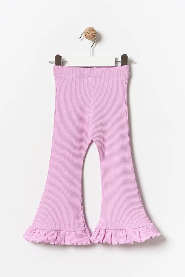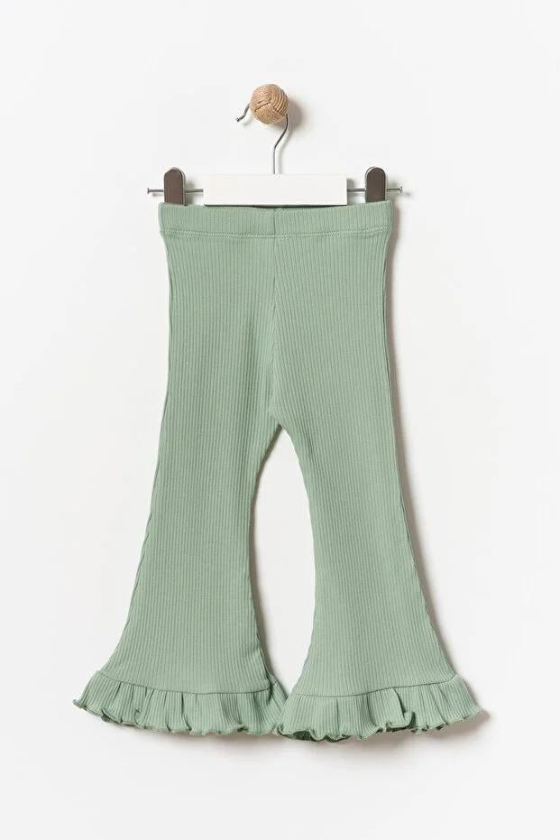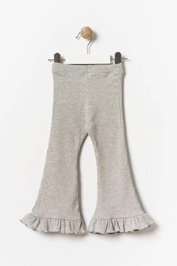 Üç parçalı pamuklu ribana tayt seti. Esnek bel yapılı, fırfır paça detaylı. Yumuşak dokulu kumaşıyla günlük kullanıma uygundur.