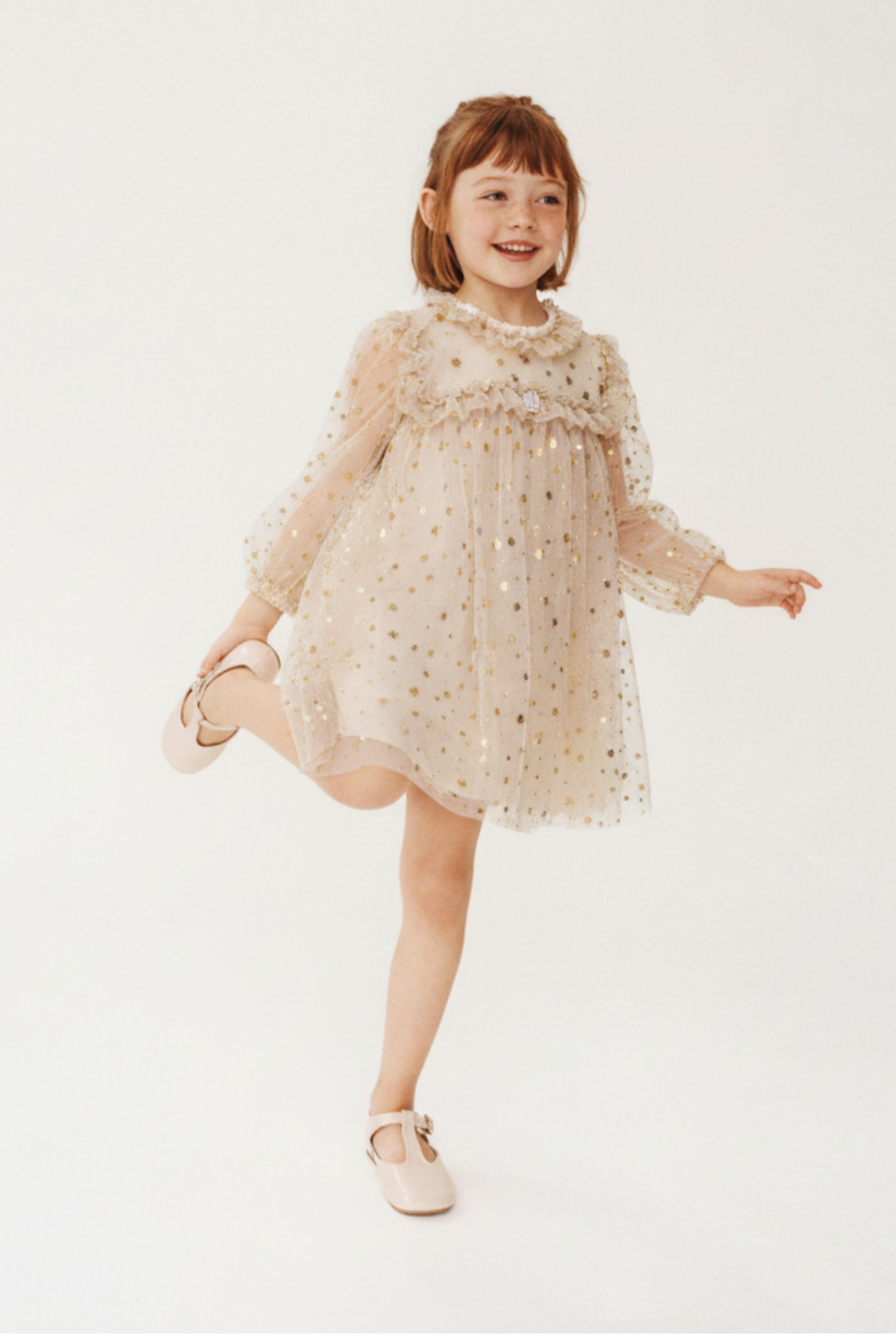 Uzun kollu, tül kumaş üzerine altın yıldız baskılı, volanlı yakalı bej elbise. Konforlu pamuklu astarlı.