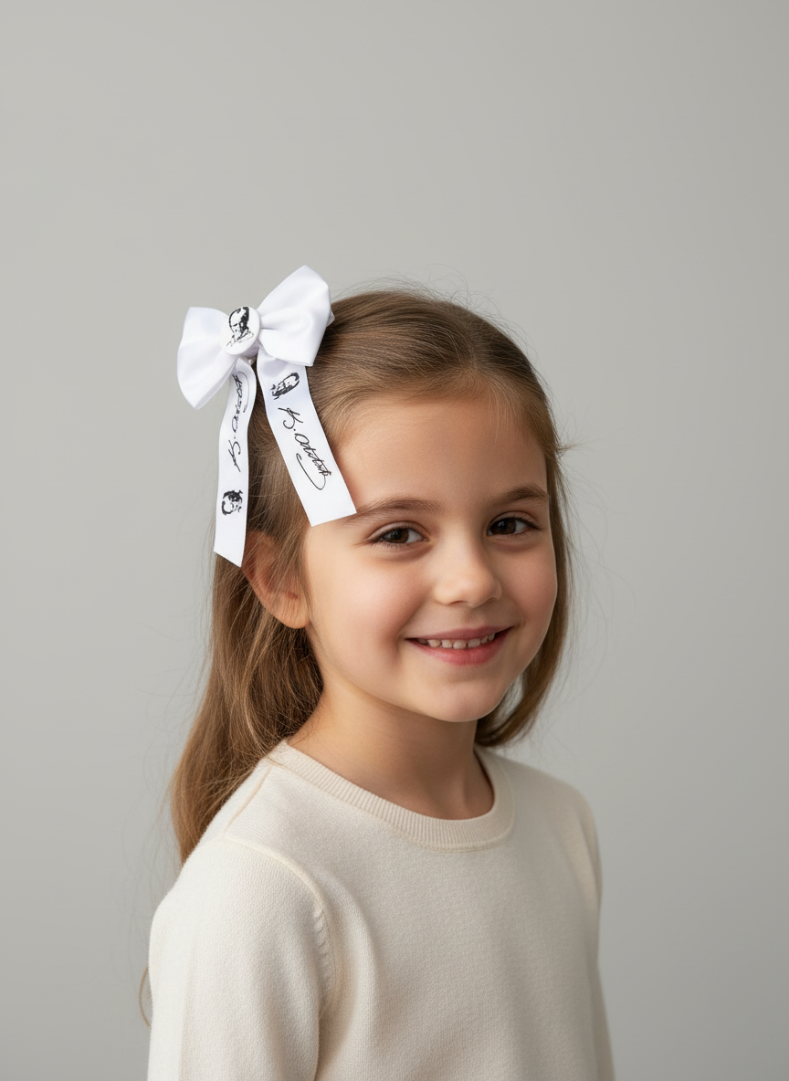 Pamuklu kumaştan üretilmiş beyaz fiyonk toka. Atatürk imzalı zarif tasarımıyla özel günlerde ve günlük kullanımlarda şıklık kazandırır. Saça kolayca takılır, rahat kullanım sağlar.