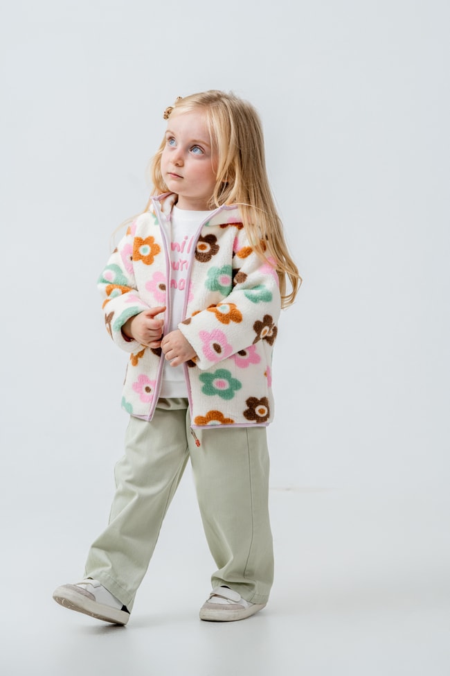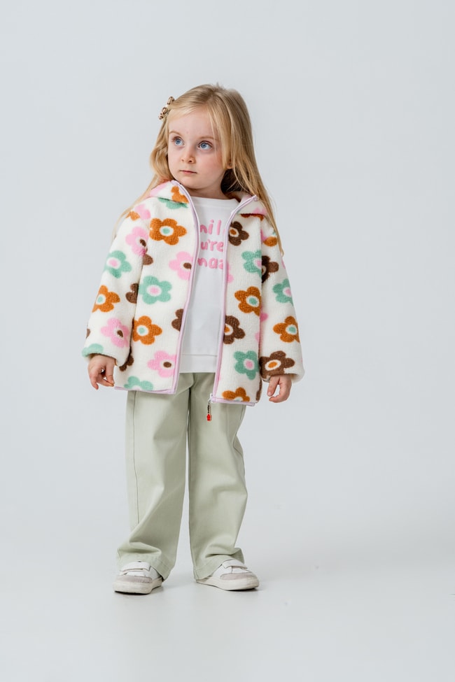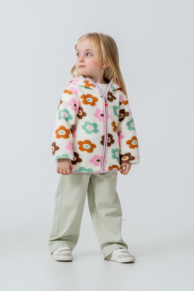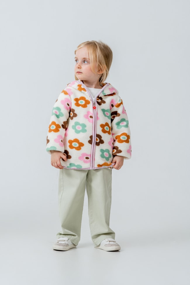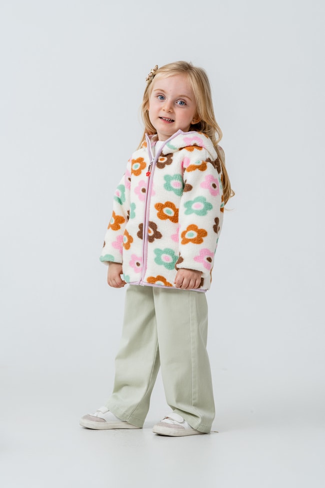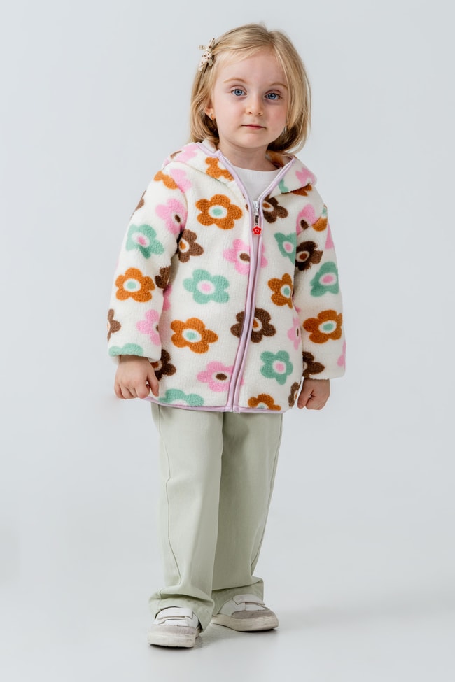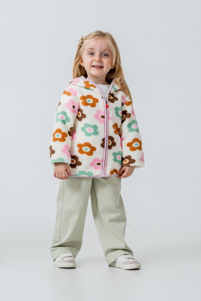 Yumuşak dokulu, kapüşonlu, fermuarlı çiçek desenli pamuklu polar ceket.