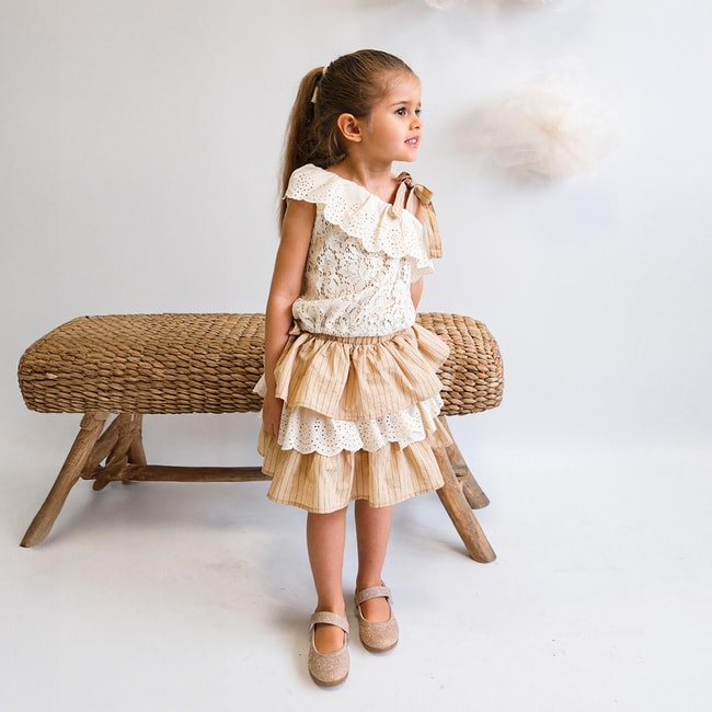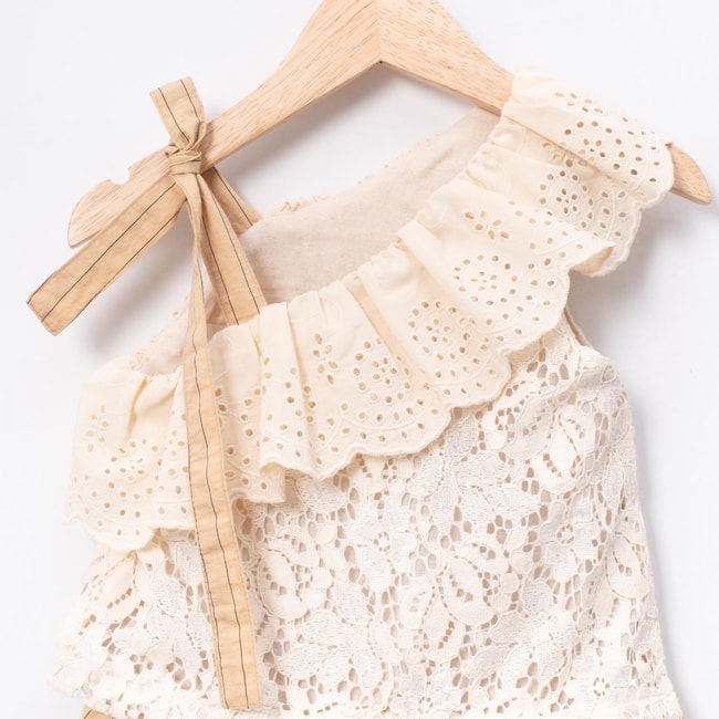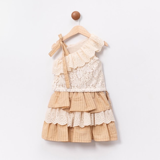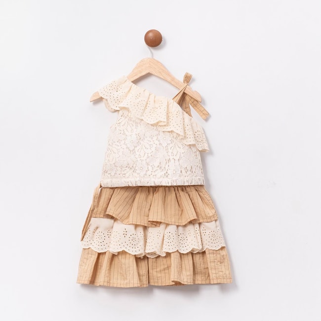 Zarif ve özgün tasarımıyla dikkat çeken bu iki parçalı kız çocuk takımı, yaz aylarında hem şıklık hem de rahatlık sunar. Üst kısmı tek omuzlu, dantel kumaştan tasarlanmış olup fiyonk ve broderie anglaise fırfır detayıyla tamamlanmıştır. Alt parça ise çizgili pamuklu kumaştan yapılmış kat kat fırfırlı etek formundadır.